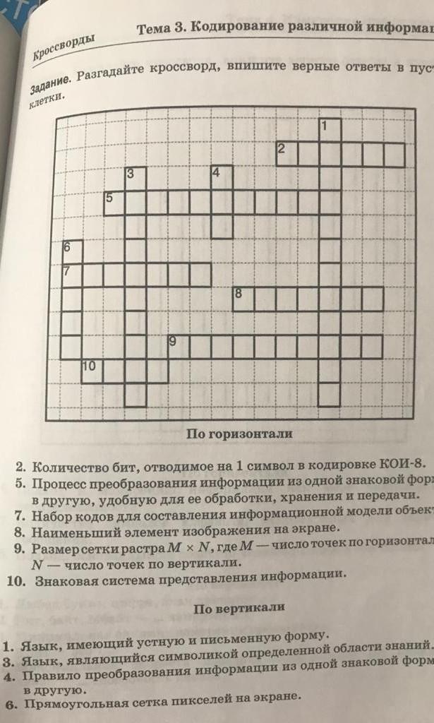1) литературный 2) Восемь 4)Код 5) Кодирование 6) растр 8) Пиксель 9)разрешение 10)язык