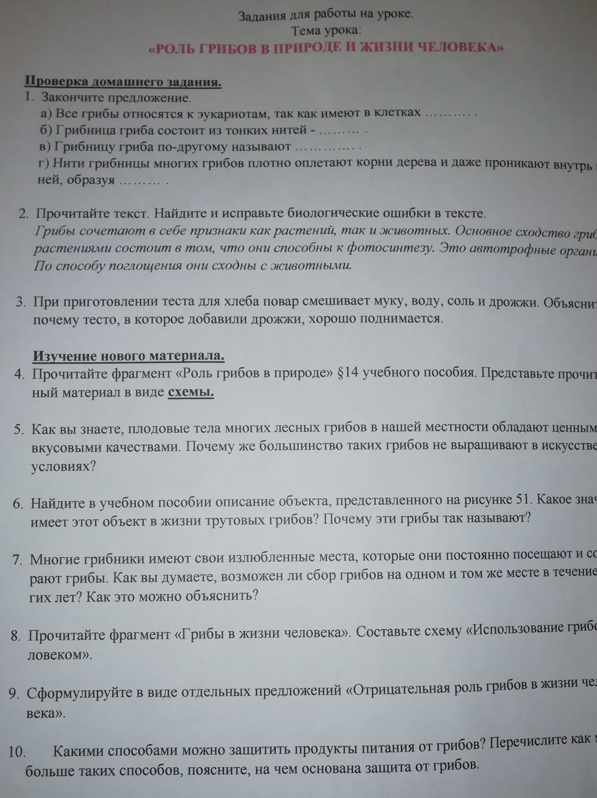 9.Грибы играют огромную роль в жизни человека. Они нашли свое применение и в медицине, и в пищевой промвшленности. Очень много появилось блюд, посвящённых им, а также появилось много выздоровивших людей. Но, к сожалению, грибы также оказывают отрицательное влияние на нас, например есть некоторые виды грибов, которые вызывают у нас болезни. Они также могут вызывать болезни сельскохозяйственных растений, что тоже очень плохо складывается для нас. Ведь у нас гибнет урожай, поэтому становится нечем питаться. Но тем не менее, грибы очень важны для нас и жизнь без них была бы другой.