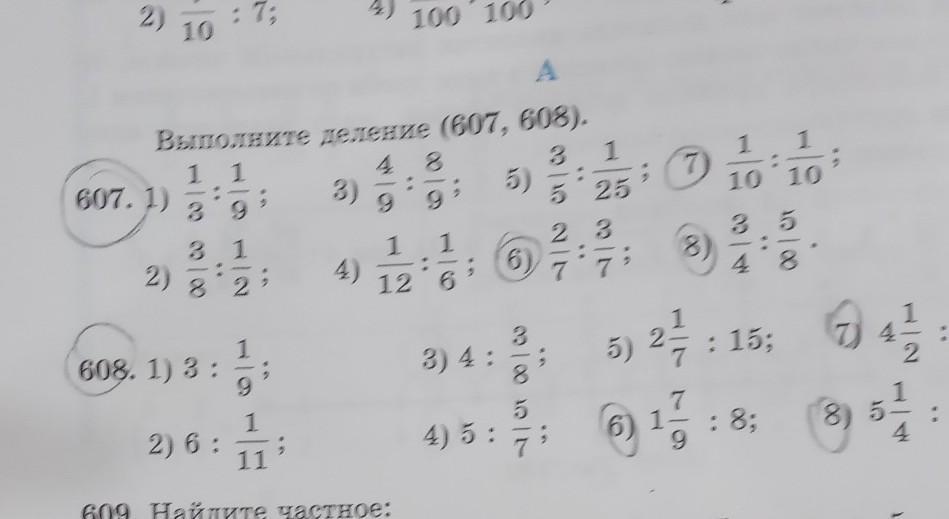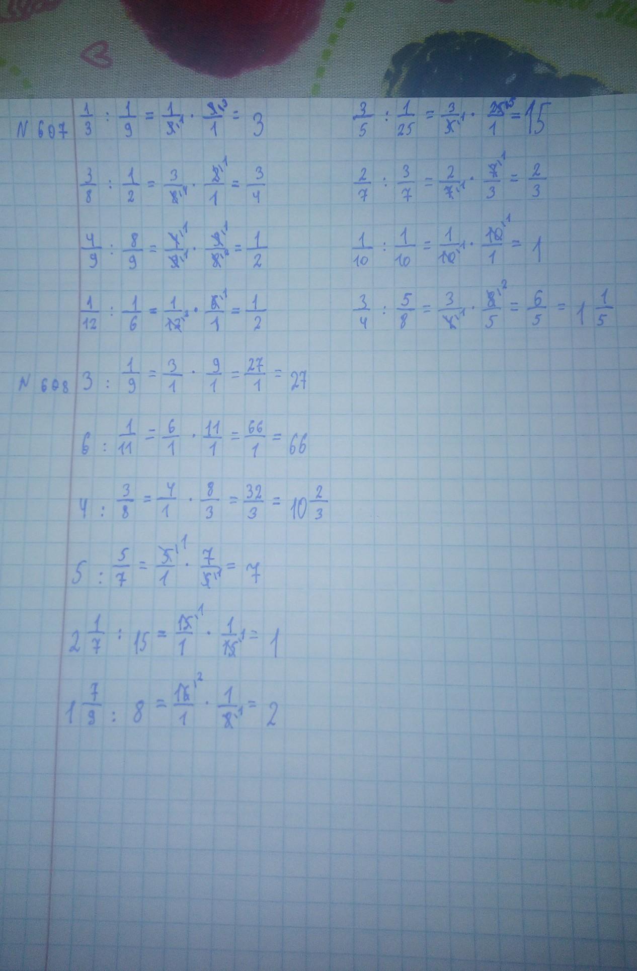короче. ты при делении левую дробь оставляешь без изменений, а правую переворачиваешь, и не делишь, а умножаешь. например, в 607 №6. 2/3разделить на 3/7. ты меняешь 3/7 на 7/3 и 2/3*7/3=2/3