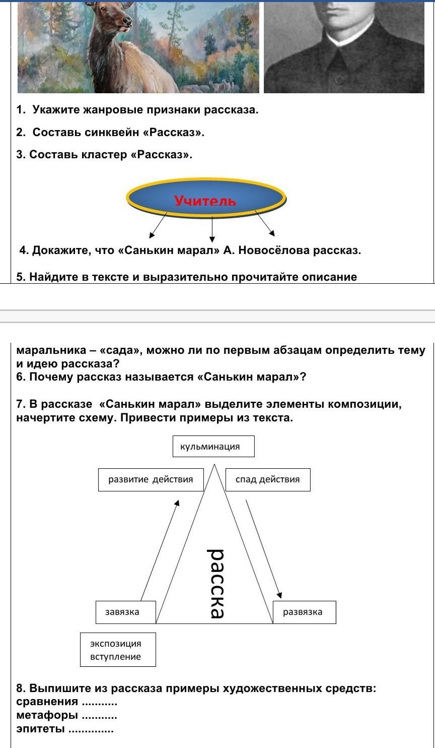 4,"Санькин марал", краткое содержание произведения ... Краткое содержание рассказа А. Новоселова "Санькин марал" можно написать так: Алексей Карпыч, охотник и егерь, держит маральник, где за высокой изгородью пасутся маралы.