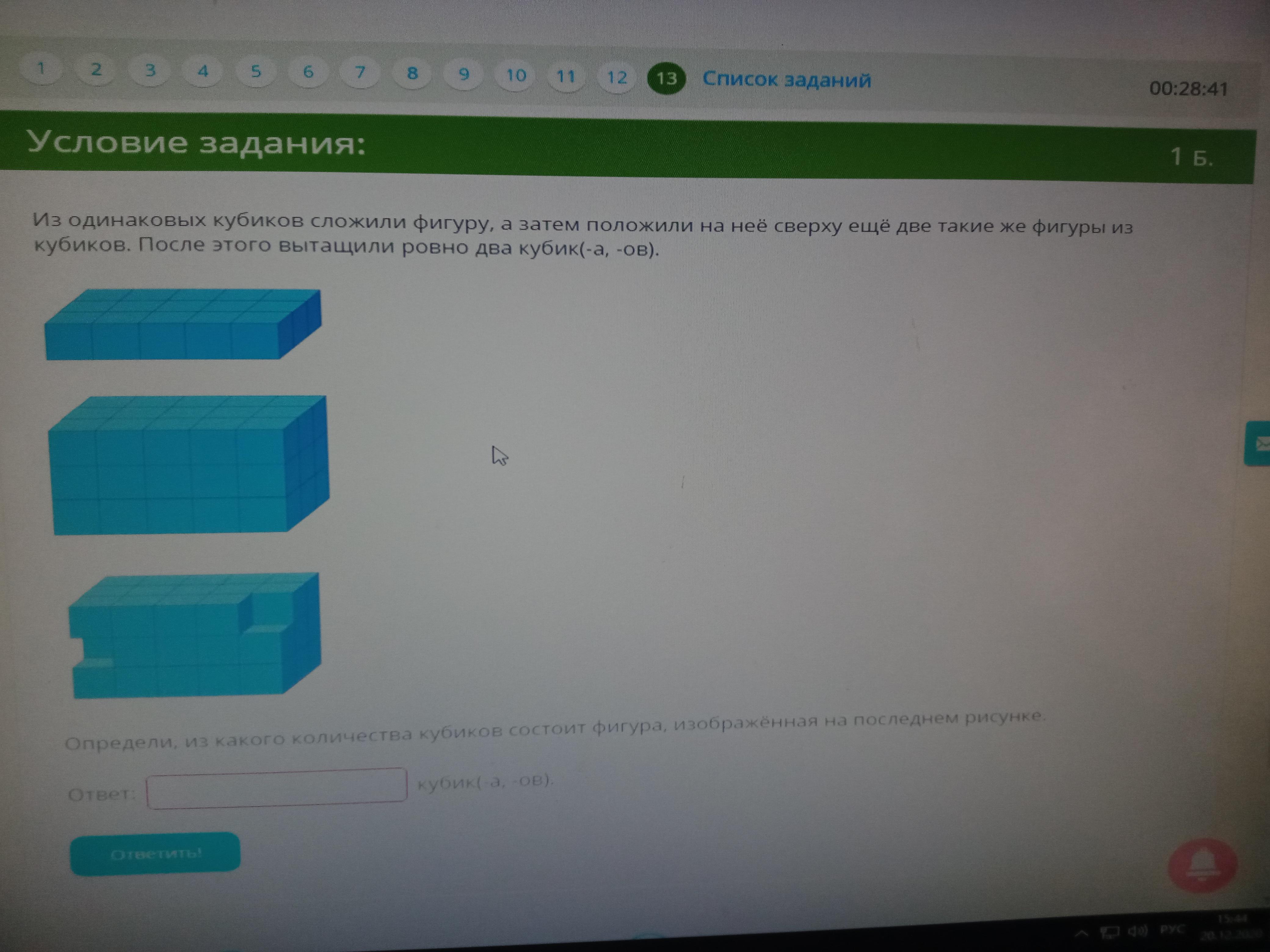 Нужно найти объем. Можно, конечно, просто посчитать количество кубиков, но мы же математики.