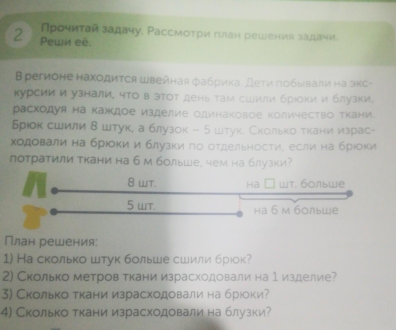 Ответ: на брюки израсходовали 16 метров ткани, а на блузки 10 метров ткани