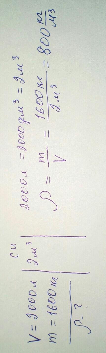 Цистерна вместимостью 2000 л наполнена керосином, масса которого равна 1600 кг. Вычислите плотность керосина?
