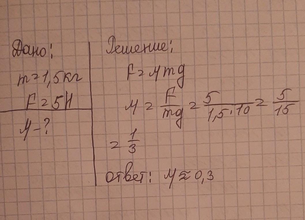 Деревянный брусок массой 1.5 кг равномерно тянут по деревянному полу с силой 5H.Найти коэффициент трения дерева по дереву