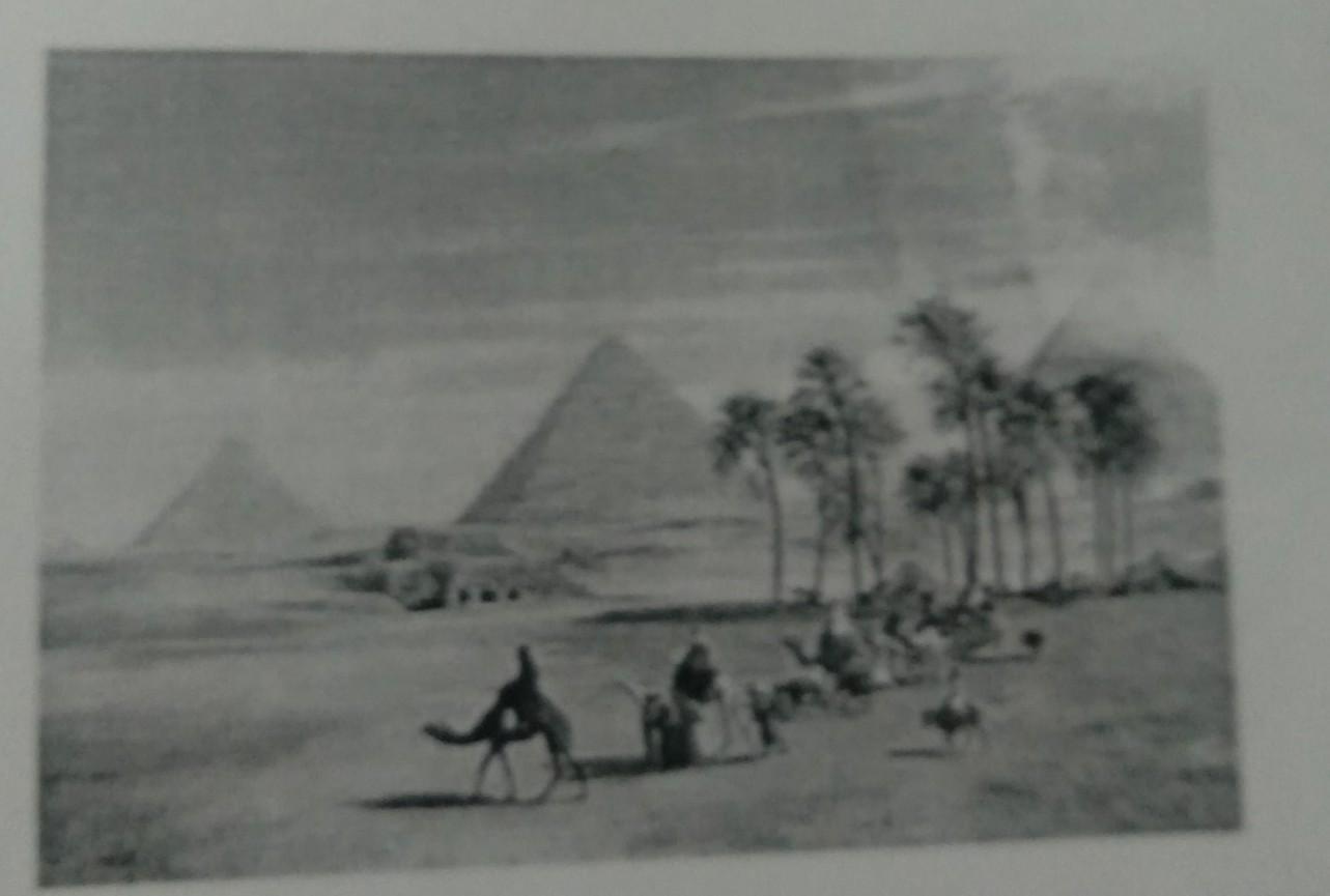 на этой картине изображён Египет.Есть на ней немного деревьев.Несколько верблюдов.И несколько людей.И 3 пирамиды.