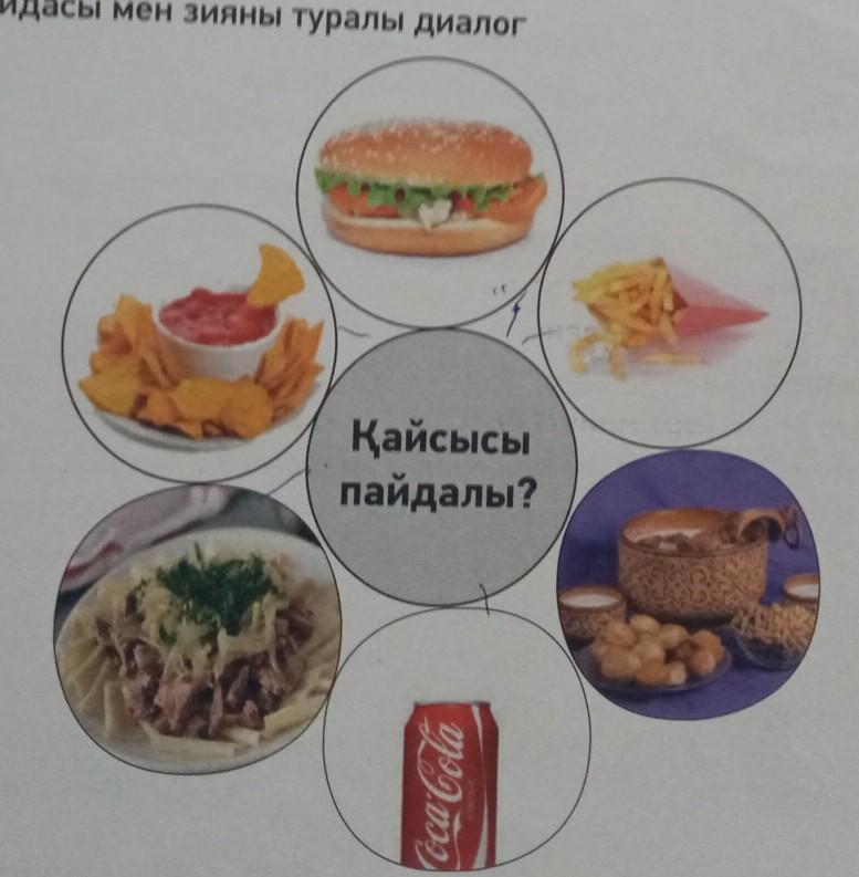 Суретке қара. Оларды ата. Суретте берілген тағамдардың пайдасы мен зияны туралы диалог құрыңдар