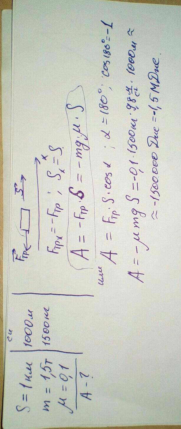 Определить работу силы трения на участие дороги в 1км, если масса авто 1.5 тонны а коэффициент трения 0.1