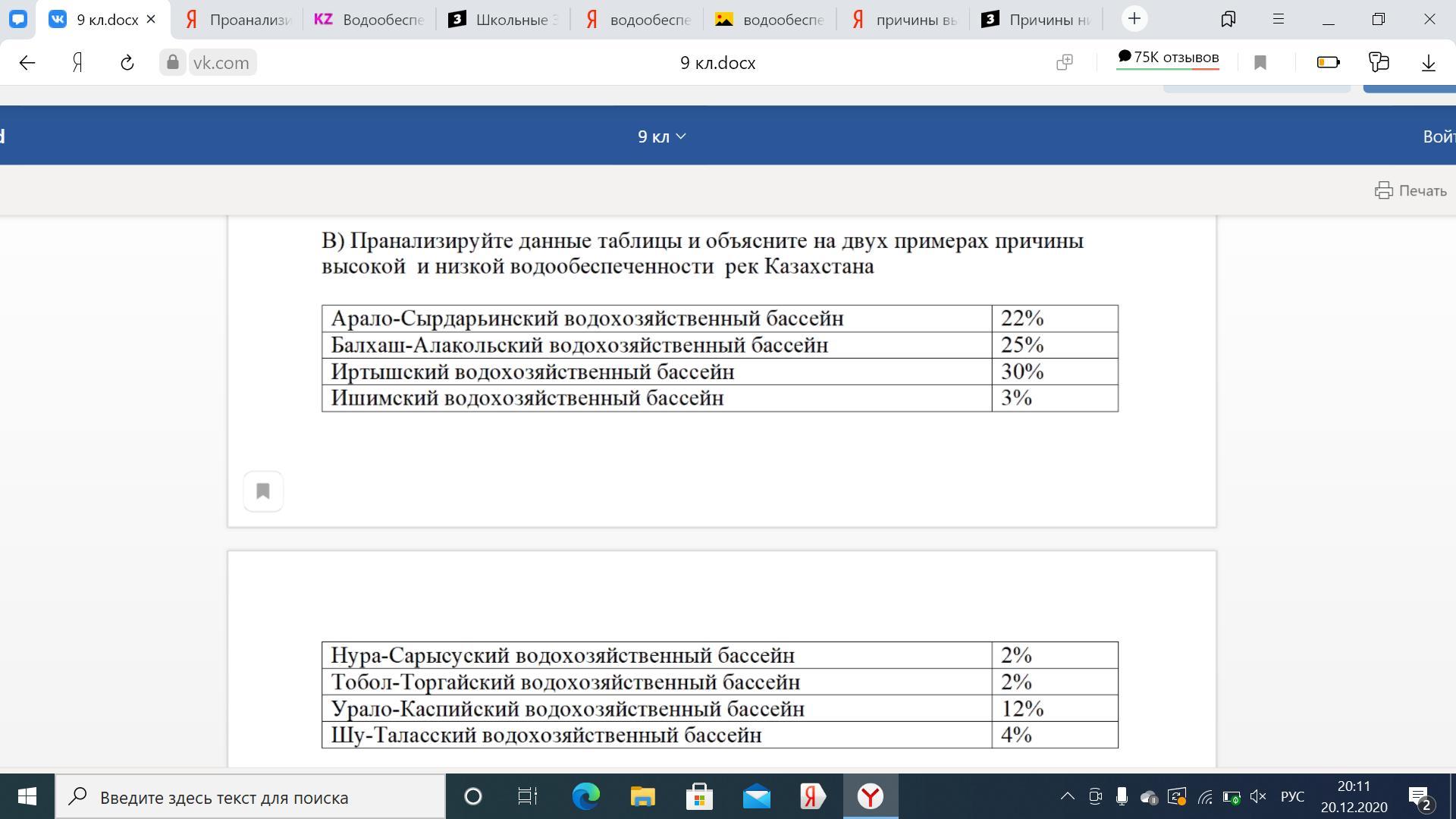 Проанализируйте данные таблицы и объясните на двух примерах причины высокой и низкой водообеспеченности рек Казахстана.