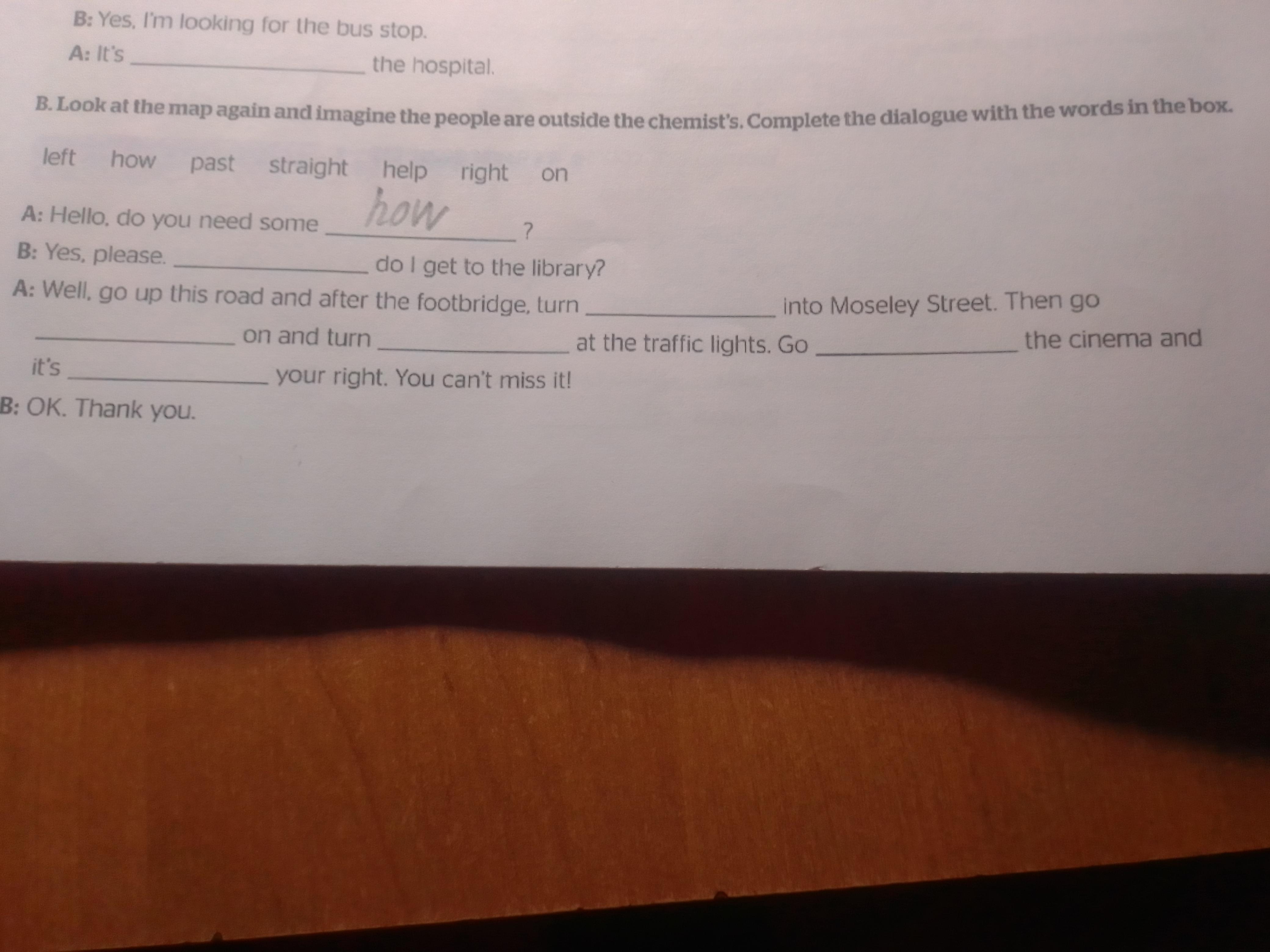 A: Well, go up this road and after the footbridge turn right/left into Moseley Street. Then go straight on and turn left/right at the traffic lights. Go past the cinema and it's on your right. You can't miss it.