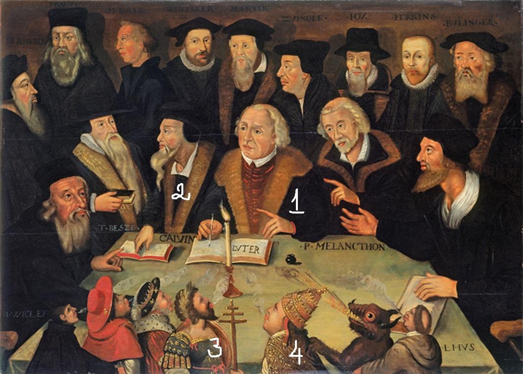 Картина, фактически, является своеобразной карикатурой, изображающей противоборство протестантов и католиков. С одной стороны Лютер (1), Кальвин (2) и прочие. С другой сторонники католицизма. Под № 4 - римский папа (папой, отлучившим Лютера от церкви был Лев Х), ну и рядом с ним, надо полагать, император Священной римской империи - Карл V. Они пытаются затушить свечу, зажженную протестантами.