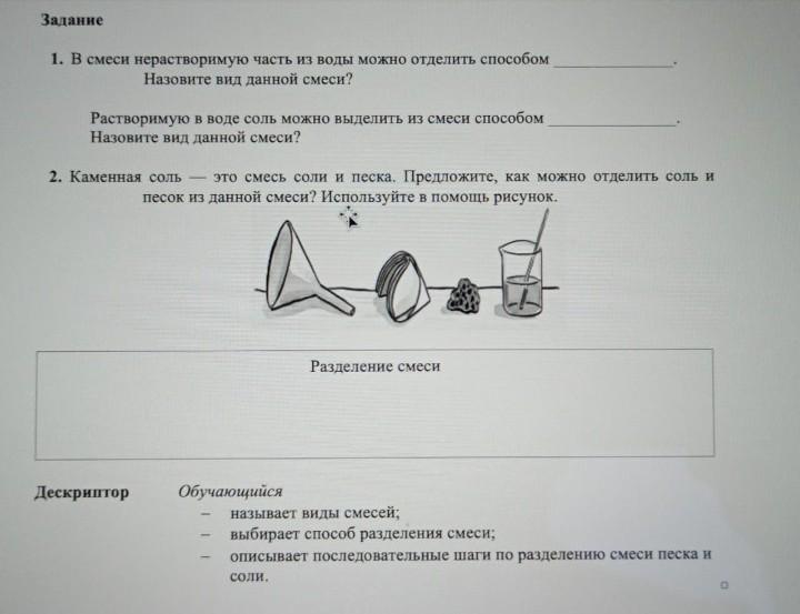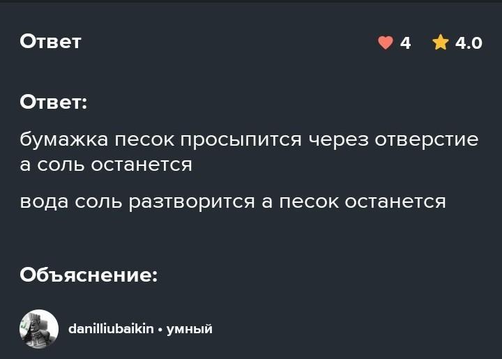 2. бумажка песок просыпается через отверстие, а соль останется