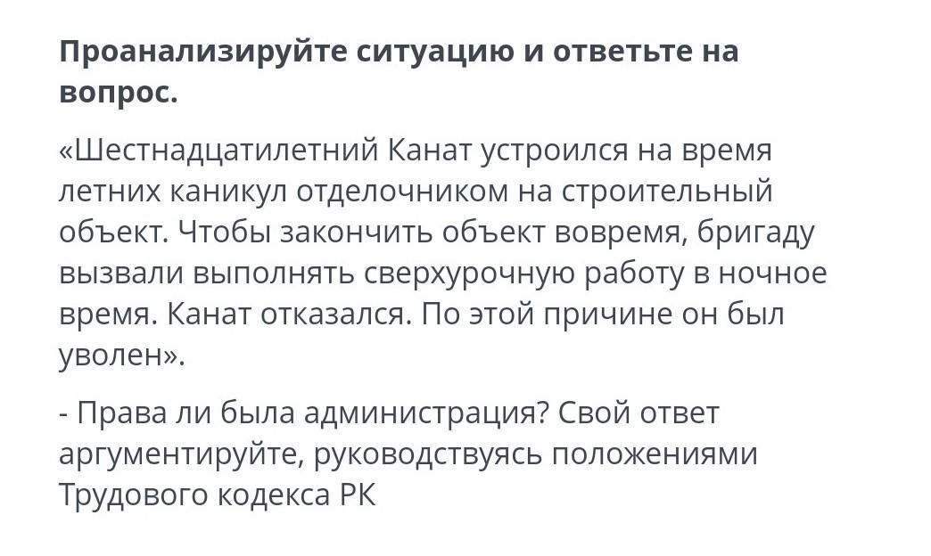 В соответствии с ч. 5 ст. 96 ТК РФ установлено, что работа в ночное время лицам, не достигшим 18-летнего возраста, запрещена. Следовательно отказ Таната от выхода в ночную смену не может служить законной причиной для его увольнения.