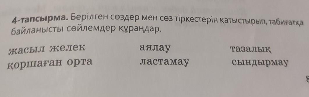 Бізді қоршап жатқан ортамыздың сұлулығынан тамсанамын!Бірақ та күннен күнге табиғатымыздың денсаклығы нашарлап барады.Қоқыстар шашылып,ауа ластанады.Сондықтан да,адамдар тазалықты сақтауды білуі тиіс.Яғни,қоршаған ортаны ластамау,қоқысты жерге шашпай,ағаштарды сындырмау және аялау керек.Себебі,ол біздің екінші жаратқан анамыз.Сондықтан да,жасыл желекті аспанға желбіретіп,құрмет тұтайық.