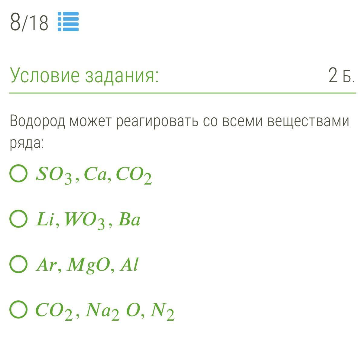 Водород может реагировать со всеми веществами ряда: S , Cl 2 , O 2. C O 2 , Na 2 O , N 2. ... N 2 O , CaCl 2 , O 2.