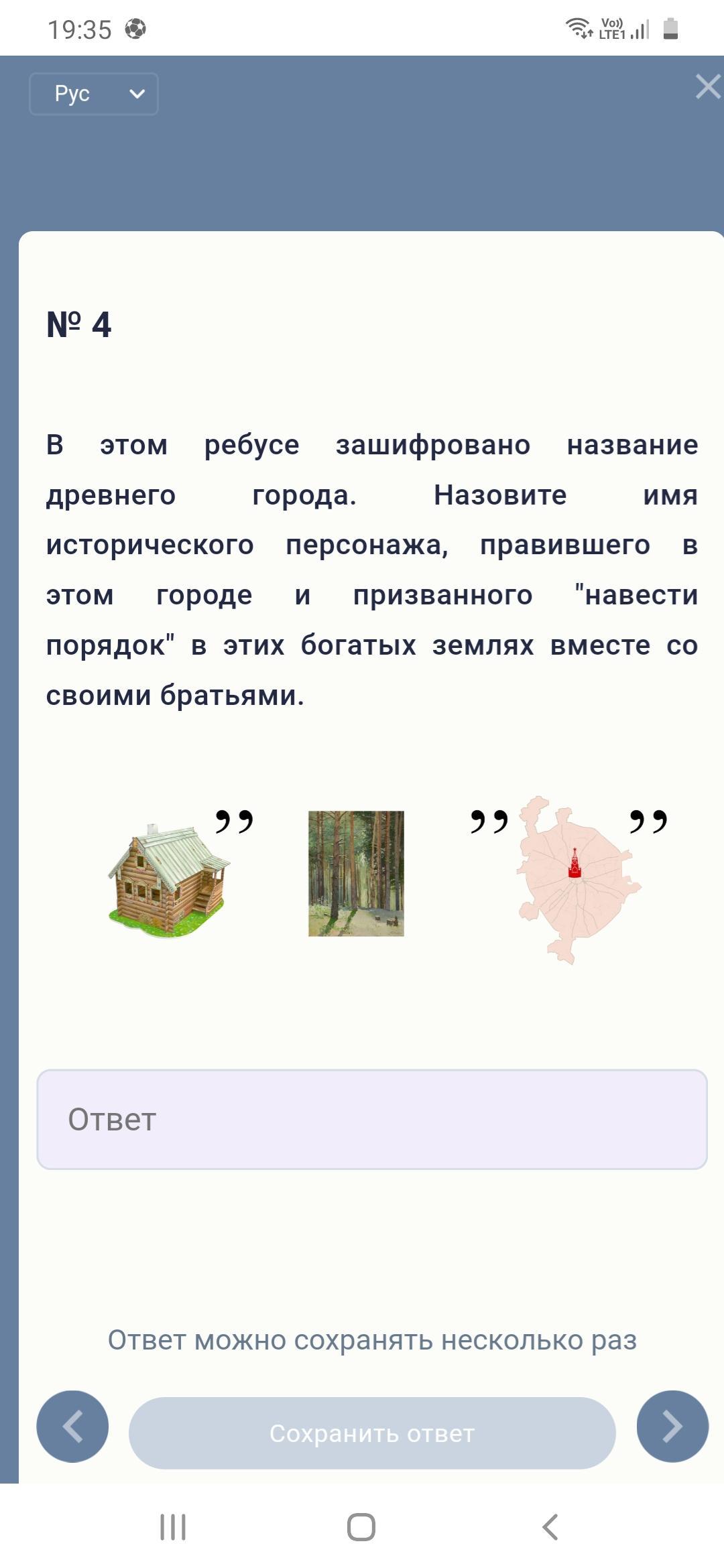 В этом ребусе зашифровано название древнего города. Назовите имя исторического персонажа, правившего в этом городе и призванного "навести порядок" в этих богатых землях вместе со своими братьями.