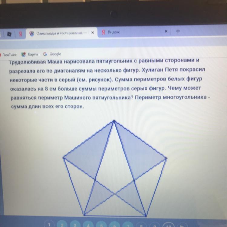 Можем заметить что у черых фигур все стороны принадлежат белым или равны имфигура а у белых за исключением стороны которая является стороной пятиугольника общие с чёрными тогда эта разница и есть сторона откуда периметр 40