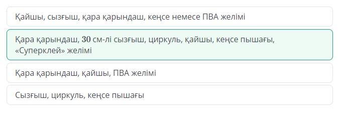 - Қара қарындаш, 30 см-лі сызғыш, циркуль, қайшы, кеңсе пышағы, «Суперклей» желімі