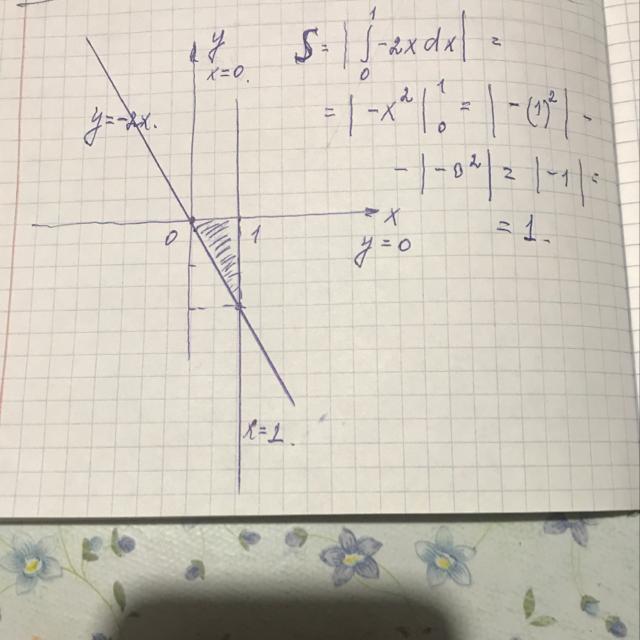 Найти площадь фигуры, ограниченной следующими линиями с помощью определенного интеграла: x=0, y=0, y=-2x, x=1.