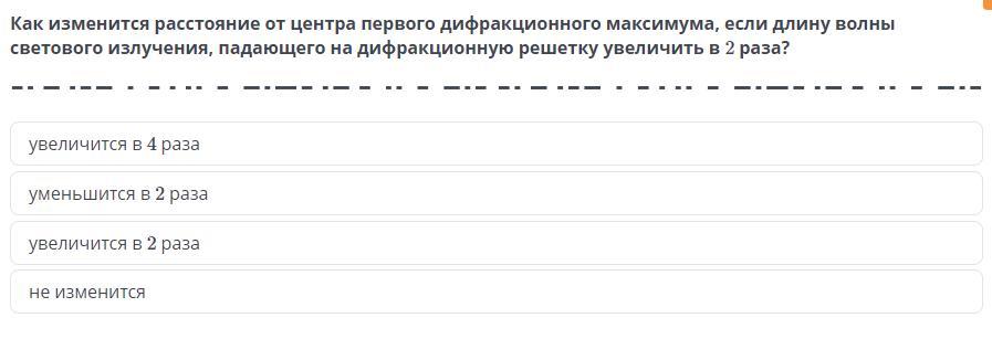 Как изменится расстояние от центра первого дифракционного максимума, если длину волны светового излучения, падающего на дифракционную решетку увеличить в 2 раза?