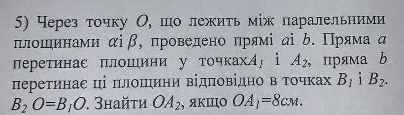 через точку О що лежить між паралельними площинами aі b проведено прямі ав б Пряма а перетинає площини у точкахA1 і A2 пряма b перетинає ці площини відповідно в точках B1 і B2. B2O=B1O. Знайти OA2, якщо OA1=8 см