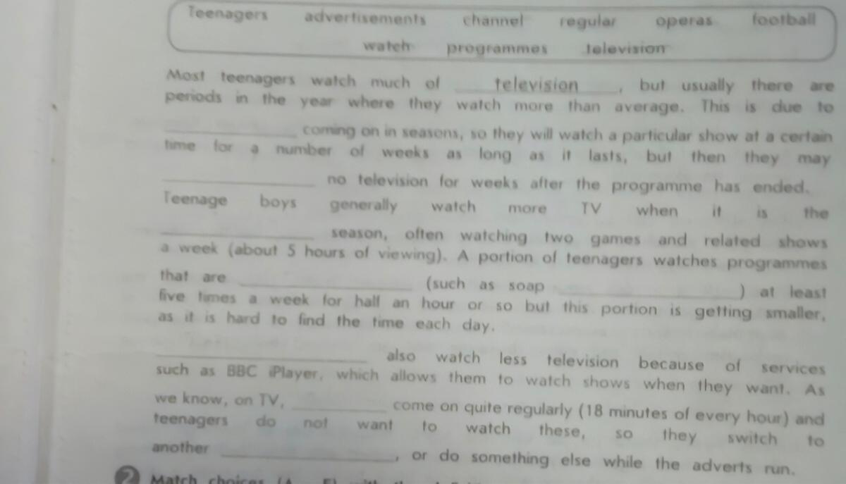 television; programmes; watch; football; regular; operas; teenagers; advertisements; channel.