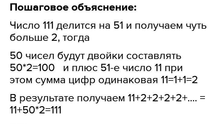 Представьте число 111 как сумму 51 натурального слагаемого так, чтобы у всех слагаемых была одинаковая сумма цифр.