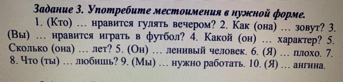 1. Мне, 2.Её, 3. Вам, 4. Его, 5.Ей, 6. Он, 7. Мне,