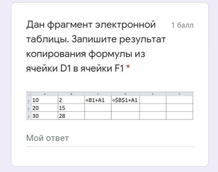 Дан фрагмент электронной таблицы. Запишите результат копирования формулы из ячейки D1 в ячейки F1