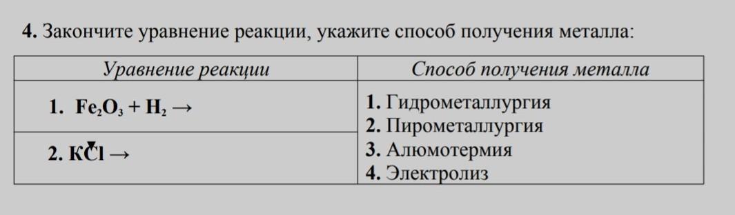 1.Fe2O3 + 3H2 = Fe + 3H2O - пирометаллургия