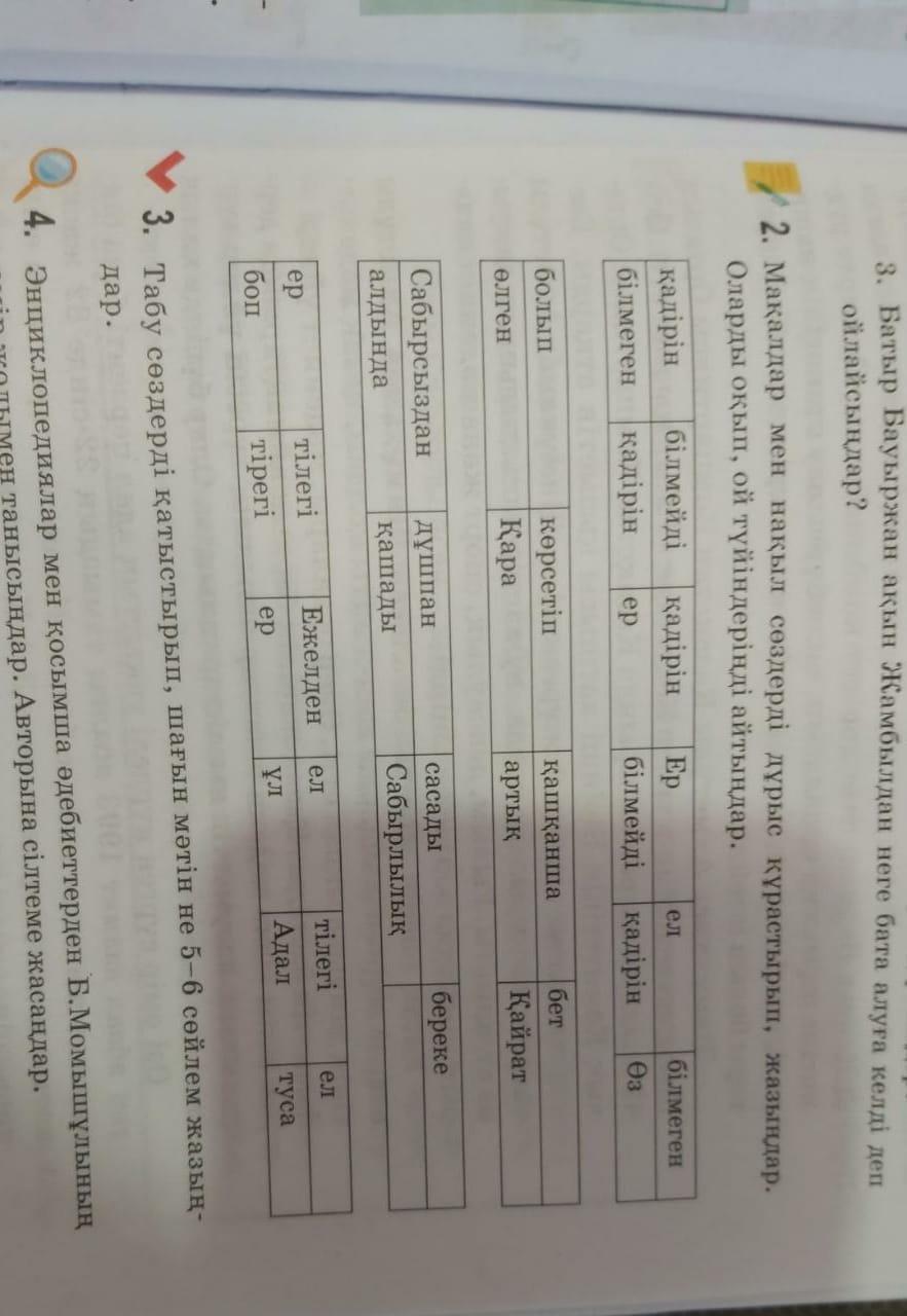 Мақалдар мен нақыл сөздерді дұрыс құрастырып, жазыңдар. Оларды оқып, ой түйіндеріңді айтыңдар.