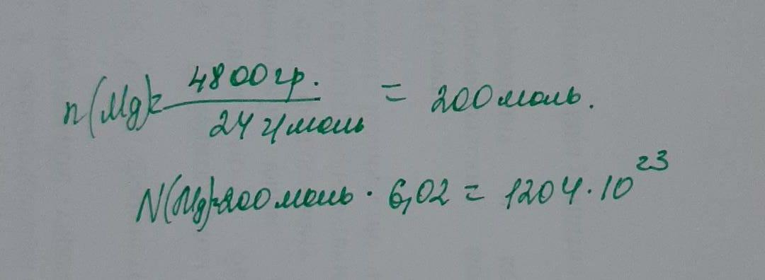 переведи вначале кг в граммы, потом найди количество вещества через массу и молярную массу7 И найдя количество вещества магния 200 моль умножь на постоянную авогадро
