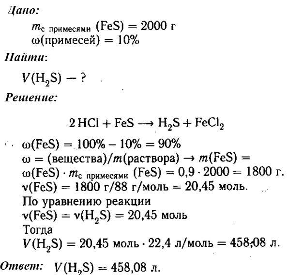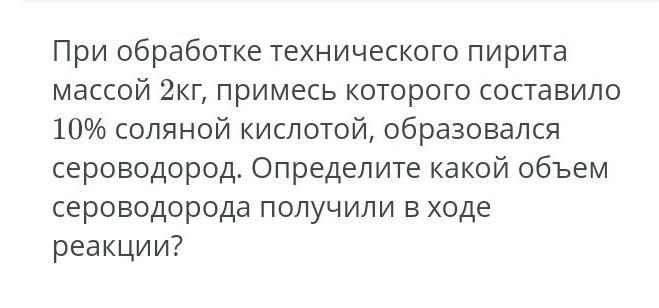 При обработке технического пирита массой 2кг, примесь которого составило 10% соляной кислотой, образовался сероводород. Определите какой объем сероводорода получили в ходе реакции?