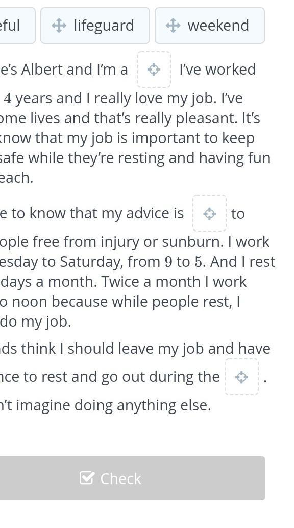 Read the text about Albert the lifeguard. Then drag the words into the right gaps to complete it.
