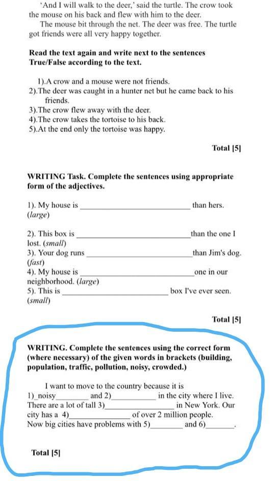 WRITING. Complete the sentences using the correct form (where necessary) of the given words in brackets (building, population, traffic, pollution, noisy, crowded.) I want to move to the country because it is 1) noisy ______and 2) ______There are a lot of tall 3) ________city has a 4) _______in the city where I live. in New York. Our of over 2 million people. Now big cities have problems with 5) ____and 6)_______