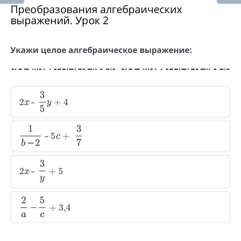- это не целое выражение, т.к. есть одночлены 2 и а, соединенные знаком деления; аналогично 5 и с.