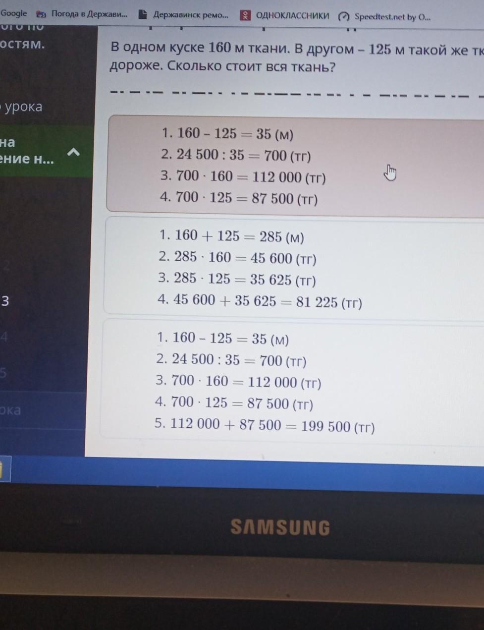 в одном куске 160 м ткани в другом 125 м такой же ткани Первый кусок на 24 500тг дороже сколько стоит вся ткань?