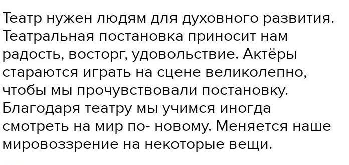 Театральная постановка приносит нам радость,восторг,удовольствие.Актёры стараются играть на сцене великолепно,чтобы мы почувствовали постановку.Благодаря театру мы учимся иногда смотреть мир по-новому.Меняется наше мировоззрение на некоторые вещи