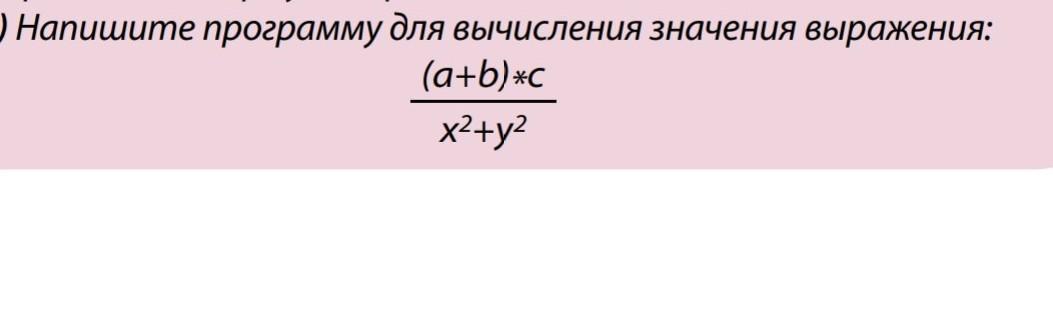print("Значение выражения:", ((a+b)*c)/((x**2)+(y**2))) #вывод на экран значения выражения