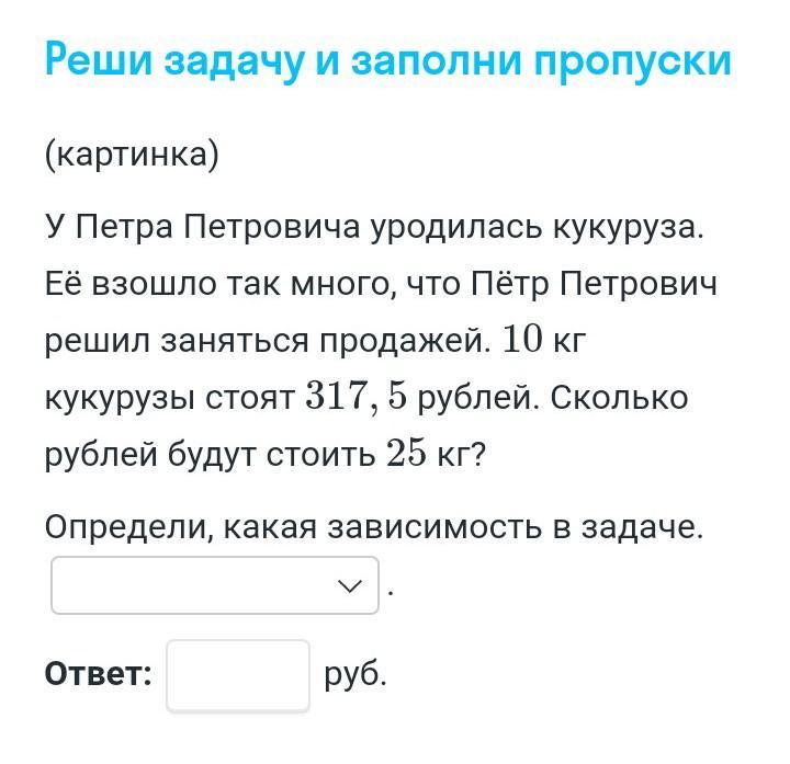 317.5 рублей разделить на 10 будет 37.5 . А 37.5 это стоимость одной кукурузы. 37.5 умножить на 25 будет 793.75 рублей. Ответ 793.5 рублей