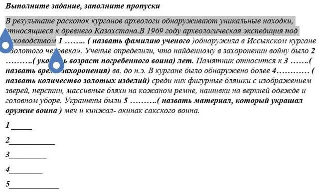 В результате раскопок курганов археологи обнаруживают уникальные находки, относящиеся к древнего Казахстана.В 1969 году археологическая экспедиция под руководством 1 …….. ( назвать фамилию ученого )обнаружила в Иссыкском кургане «Золотого человека». Ученые определили, что найденному в захоронении войну было 2 ……….( указать возраст погребенного воина) лет. Памятник относится к 3 …….( назвать время захоронения) вв. до н.э. В кургане было обнаружено более 4………… ( назвать количество золотых изделий) среди них фигурные бляшки с изображением зверей, перстни, массивные бляхи на кожаном ремне, нашивки на верхней одежде и головном уборе. Украшены были 5 ……….( назвать материал, который украшал оружие воина ) меч и кинжал- акинак сакского воина.