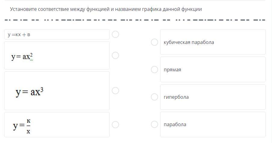 Установите соответствие между функцией и названием графика данной функции