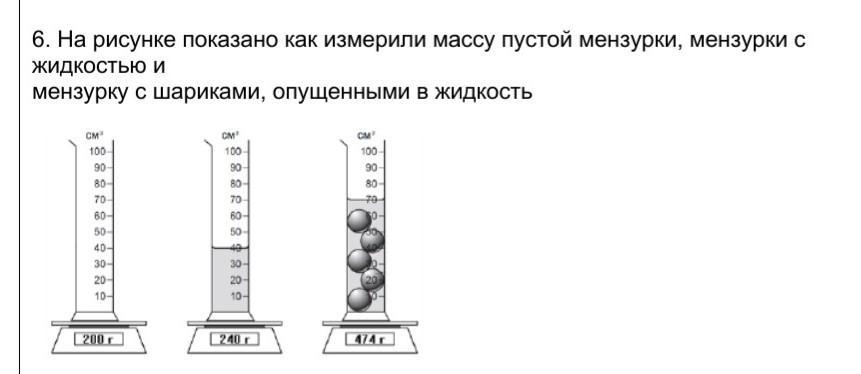 1) найдем объем одного шарика V= (V2-V1)/5=(70-40)/5=6 см3