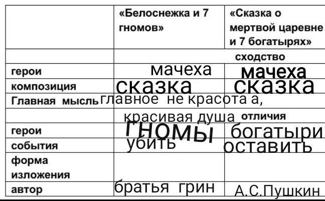 Укажите сходства и различия Белоснежки и семь гномов из Сказки о мертвой царевне Александр Сергеевич Пушкин Запиши ответы в таблицу