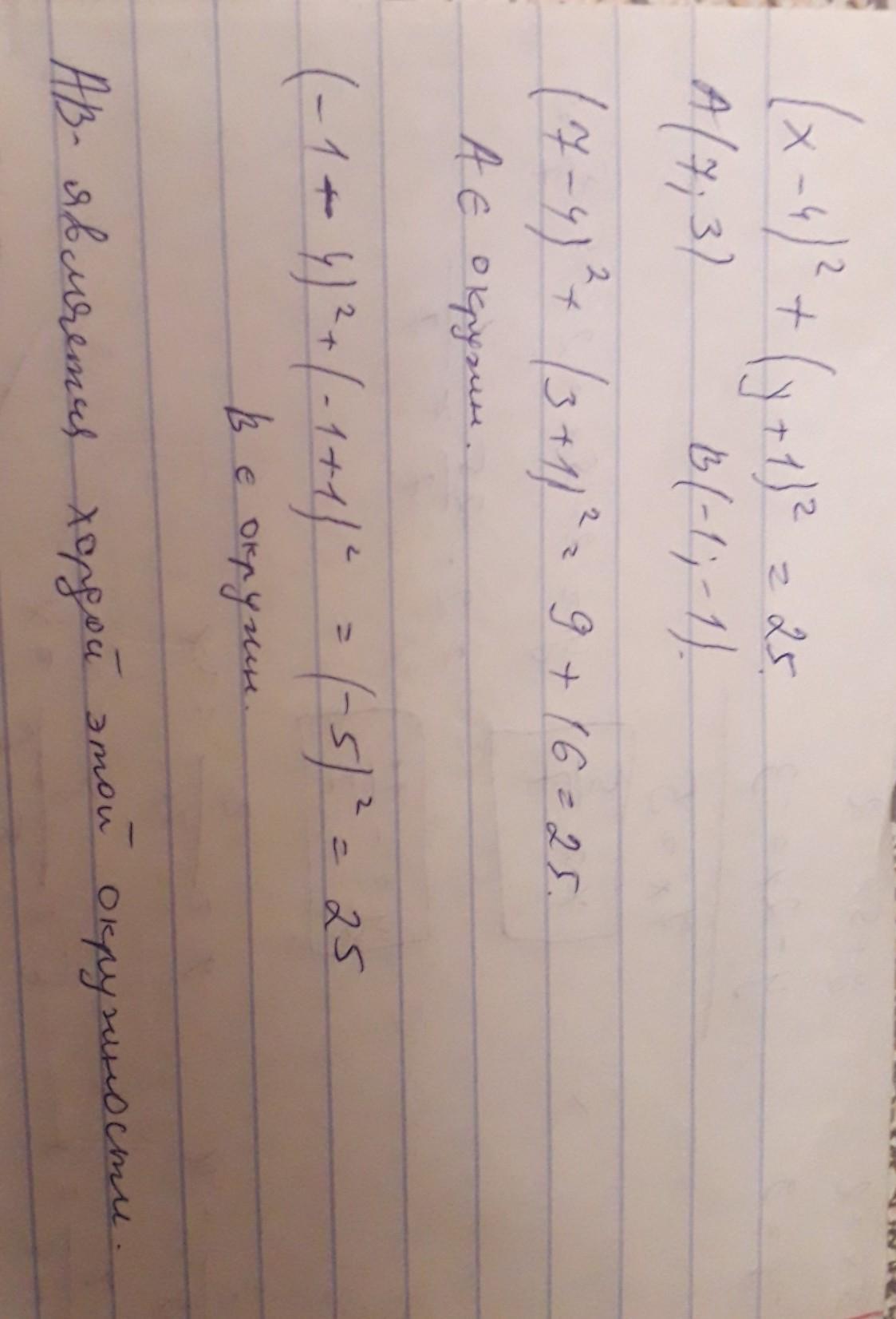 Является ли AB хордой этой окружности, если А(7;3), В(-1;-1)?