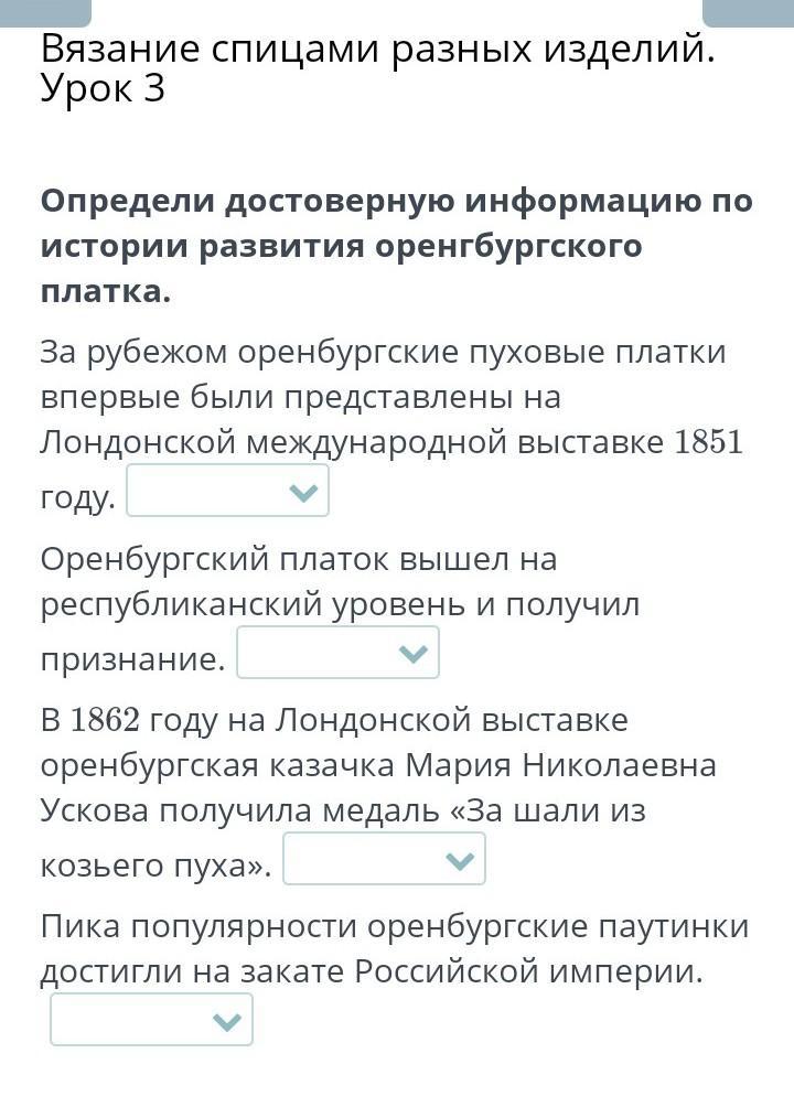 Определи достоверную информацию по истории развития оренгбургского платка.
