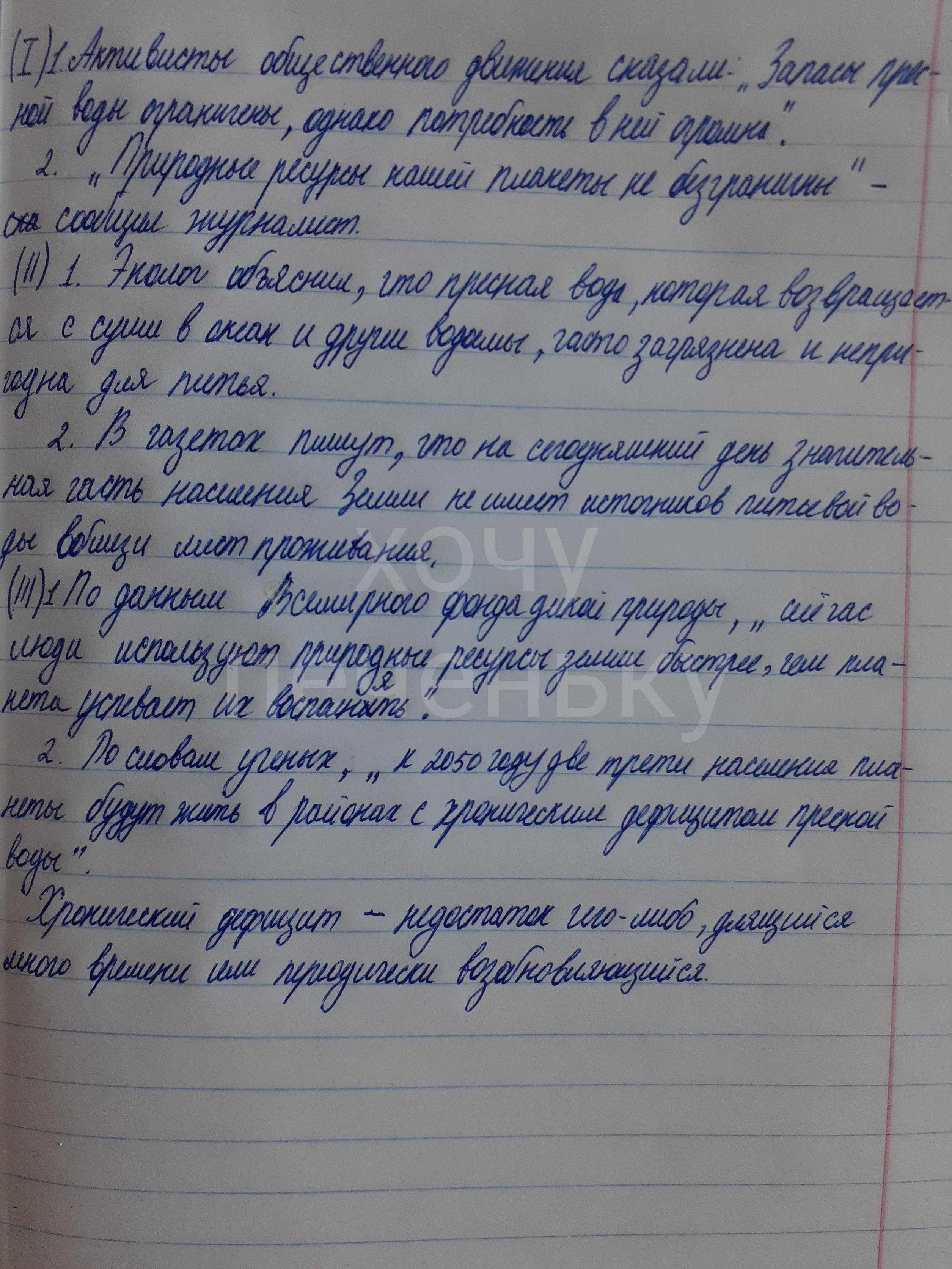 III 1. (Данные Всемирного фонда дикой природы ) Сейчас люди используют природные ресурсы земли быстрее ,чем планета успевает их восполнять . 2. ( Учёные) .К 2050 году две трети населения планеты будут жить в районах сохранить с хроническим дефицитом пресной воды .
