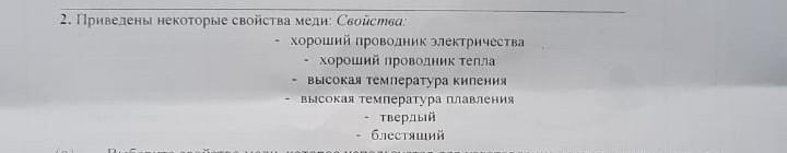 Я плохо поняла задание, но тут, кажется, нужно найти то свойство, которое не подходит меди. Т.е 5 свойство (твёрдый).