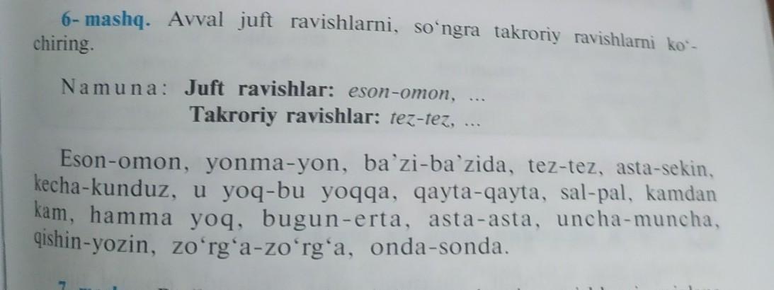 Juft ravishlar: Eson-omon, yonma-yon, ba'zi-ba'zida, asta-sekin, kecha-kunduz, u yoq-bu yoqqa, sal-pal, kamdan kam , hamma yoq, bugun- erta, uncha-muncha, qishin-yozin, onda-sonda.