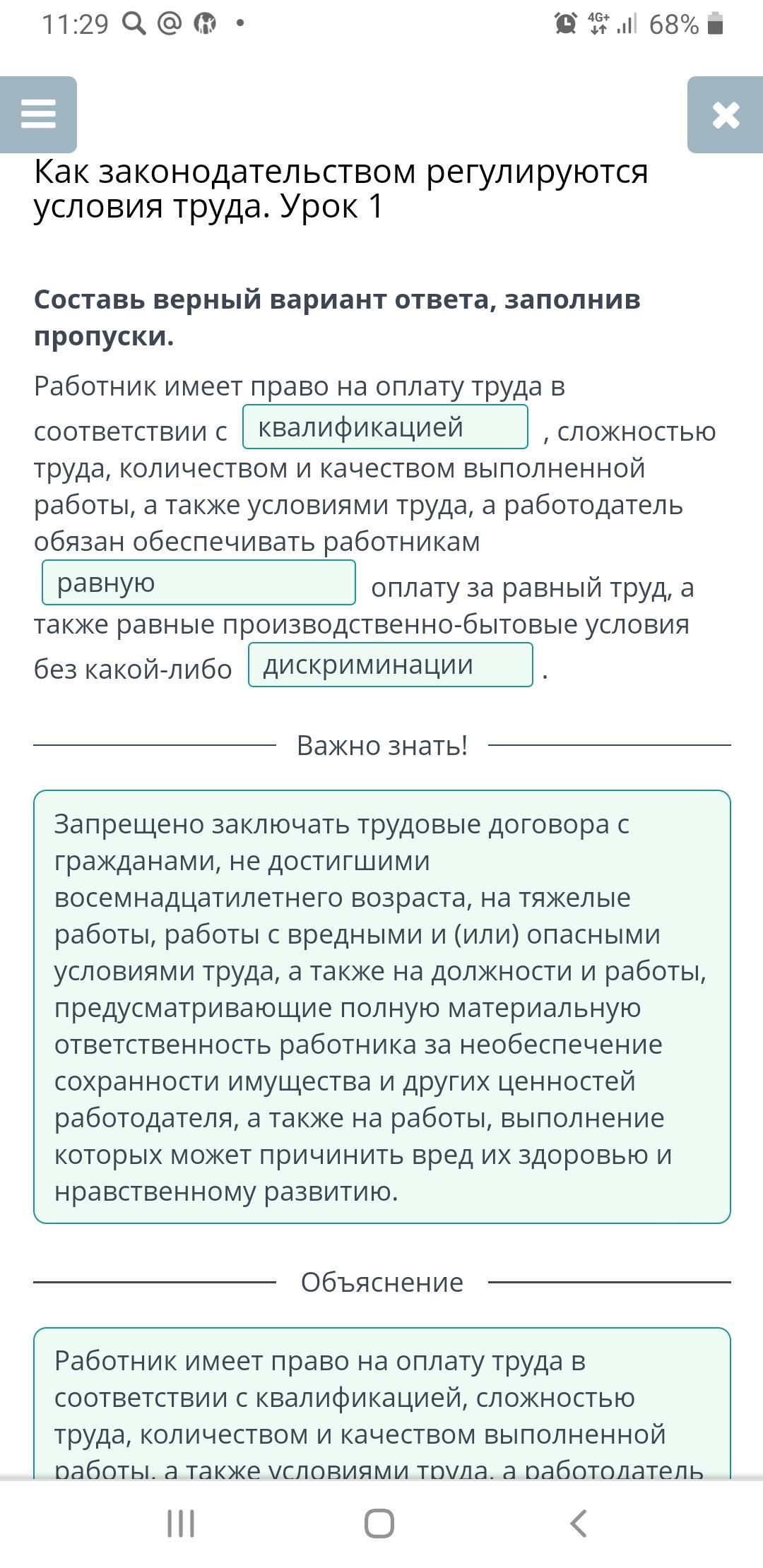 Работник имеет право на оплату труда в соответствии с______________ ,сложностью труда, количеством и качеством выполненной работы, а также условиями труда, а работодатель обязан обеспечивать работникам ______---оплату за равный труд, а также равные производственно-бытовые условия без какой-либо___________