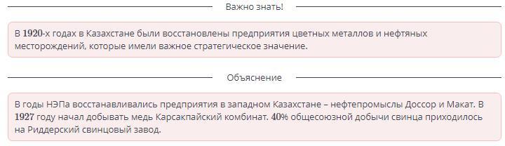 В годы НЭПа в Западном Казахстане восстанавливались предприятия: нефтепромыслы ДОССОР и МАКАТ. В 1927 году начал дрбывать медь КАРСАКПАЙСКИЙ комбинат. 40% общесоюзной добычи свинца приходилось на РИДДЕРСКИЙ свинцовый завод.